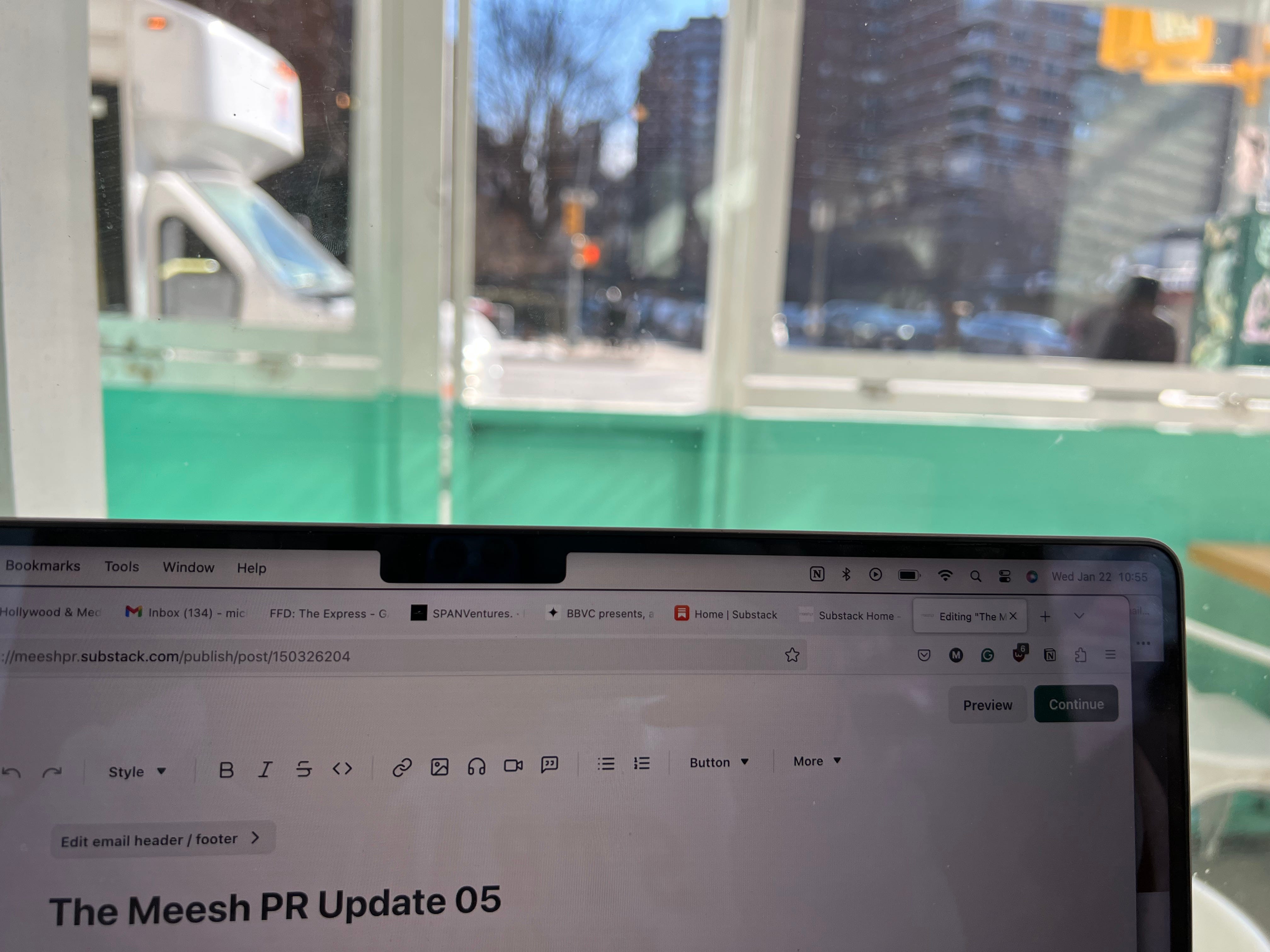 Welcome to Issue 05 of the Meesh PR Update! And Happy New Year! This issue is very much long overdue, but filled with topics that have been top of mind the past few months. I’m starting this from Citizens of Chelsea and it’s currently extraordinarily cold (17ºF!) even as I sit in a cute corner inside with the sun shining down on me as I people-watch through the window. But I’m wearing one of my favorite hoodies and staying busy writing this (while taking many knitting breaks) so I think it’ll be okay for now.