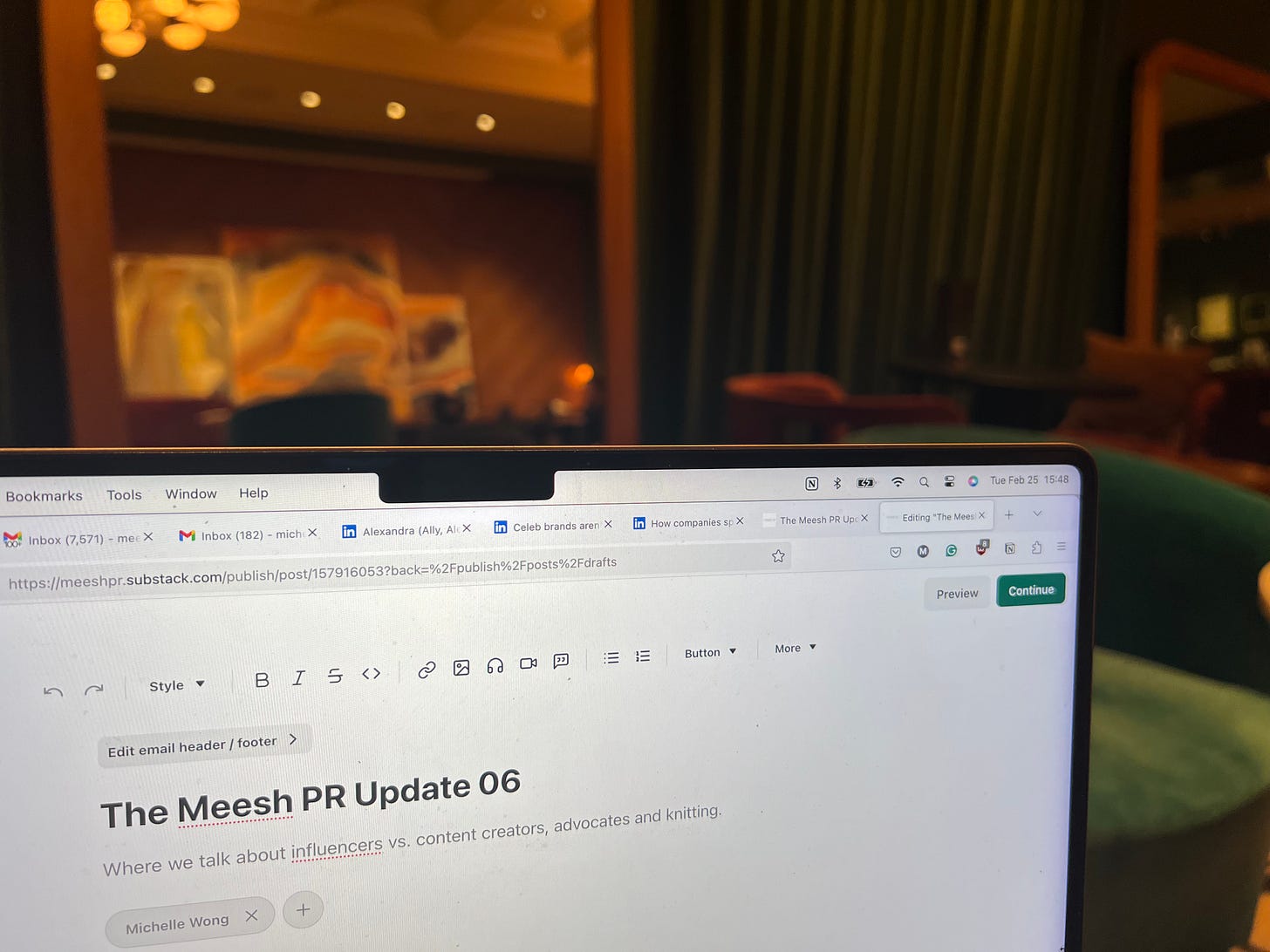 Welcome to Issue 06 of the Meesh PR Update! I’m starting this issue from the beautiful and amazing NYC Chief clubhouse. (And yes, I started this issue literally a month ago.) While I unfortunately didn’t work in corporate long enough to qualify as a member, I have many friends who do and I’m lucky enough to be invited for events and coworking dates. Something I’ve been doing a lot lately is just having coworking dates with my friends who WFH or are freelance – it’s a great way to get some quality time with a beloved friend while also getting some work done. We always feel like we’re back in university, in the dorms or each other’s rooms getting homework done!